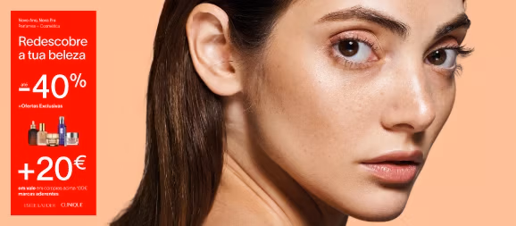 Promoção válida de 2 a 31 de janeiro de 2026. Em compras no valor de 100€ ou superior (valor pago - *exceto marcas Estée Lauder e Clinique), receba um Vale de 10€ para usufruir de 1 a 28 de fevereiro de 2026 em compras de Cosmética (Dermocosmética e Cosmética Seletiva) no valor de 50€ ou superior (valor pago). Não acumulável com outras promoções, abate de pontos ou produtos em PROMOÇÕES. Válido para clientes com cartão Like me ou na adesão ao mesmo. Rebate válido de acordo com condições impressas no Vale.