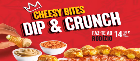 *Oferta válida para Pizza CHEESY BITES OH MY VEGGIE, CHEESEHAM, PEPPERONI LOVERS ou PORTUGUESA por 20,85 €, ideal para 3 pessoas. Preço por pessoa 6,95 €, para a composições indicadas, para o mínimo de 3 pessoas e limitado a múltiplos de 3 pessoas. Restantes composições de CHEESY BITES com opção DIP&CRUNCH por +1 €. Válido de 29/10/25 até 06/01/2026. Imagens ilustrativas. IVA incluído à taxa legal em vigor.